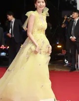 柳岩身穿明黄色深V长裙甜美微笑,清新与性感奇妙交融